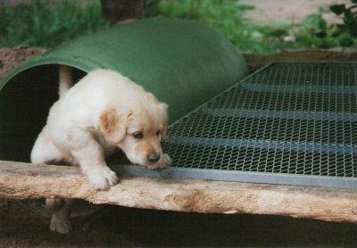 Meine Hunde sind immer voll in die Familie integriert und werden nie ausgesperrt. Die Wurfkiste steht aber nicht mitten in der Wohnung, sondern in einem ruhigen Raum, damit die Mutter sich auch voll auf die Welpen konzentrieren kann. Die instinktsichere Hündin, die während und nach der Geburt ihre Welpen umsorgt, in der ersten Zeit das Wurfzimmer kaum verlassen möchte und auch in den folgenden Wochen ihre Mutterrolle annimmt, ist für mich ein wichtiger Punkt in der Welpenaufzucht. Nur die engste Familie darf in den ersten 2 Wochen dieses Zimmer betreten ( eine Ausnahme ist der Zuchtwart, der in der ersten Woche den Wurf besichtigen muss), in der 3. Woche verlassen die Kleinen schon die Wurfkiste selbstständig und beginnen mit der Erkundung des Zimmers und  später der gesamten Wohnung  Klar bekommen sie nebenbei alle Alltagsgeräusche mit und  lernen auch die tierischen Familienmitglieder kennen. In der 4. Woche dürfen sie auch in den Garten, bekommen einen Abenteuerspielplatz mit einem Hügel, einer Sandkuhle, Büschen, einer Betonröhre und viele wechselnde Geräte, wie Balancierteller, Wackelbretter, verschiedene Bodenbeläge, Klettermöglichkeiten, Zelte, Spieltunnel, jede Menge Spielzeug und natürlich reichlich menschliche Zuwendung. Durch den Pferdehof ist immer viel los und langweilig wird es den Kleinen kaum. Besucher sind herzlich willkommen! Die Welpen sollen fremde Menschen und besonders Kinder kennenlernen. Meist ist daran kein Mangel. Freunde, Bekannte und natürlich die Welpeninteressenten sind gerngesehene Gäste. Die Welpen müssen viele Eindrücke verarbeiten und brauchen deshalb auch jede Menge Schlaf, diese Bedürfnisse müssen von Besuchern akzeptiert werden. Die Welpen haben immer die Möglichkeit, sich in ihren Schlafbereich zurückzuziehen und werden dort nicht gestört. Je nach Milchleistung bekommen die Welpen in der 4. Woche auch die erste feste Nahrung. Die Fütterung erfolgt aus einem gemeinsamen Napf. Die Welpen sollen sich auch weiterhin durchsetzen müssen, wie an den mütterlichen Zitzen. Wenn ein Welpe bei einer Mahlzeit zu wenig abbekommt, wird er sich bei der nächsten mehr holen, denn der Hunger wird sein Bemühen verstärken.